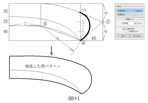 矩形右側のたて線1/2位置ⓒに交わる補助線をひき、襟先をメニュー【角丸】半径40mmで小丸(太い黒線)に修正する。