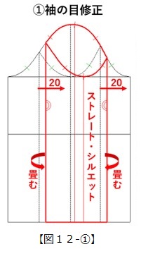 【図12】前回コラムVol.14の図9、10で解説した方法で2枚袖を作成する。概略図を①~③で示す。