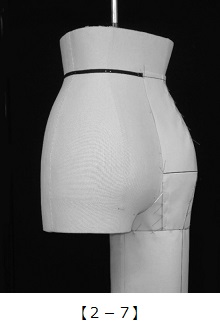 【2-7】Bブロックの下端の浮きをダーツのようにたたんで、Cブロックの脚部を結合したトワル。これでパンツの基本的なシルエットが完成する。